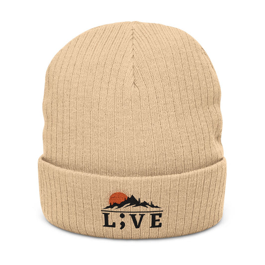 L;VE Branded Cozy Embroidered Knit Beanie with Mountain Sunset