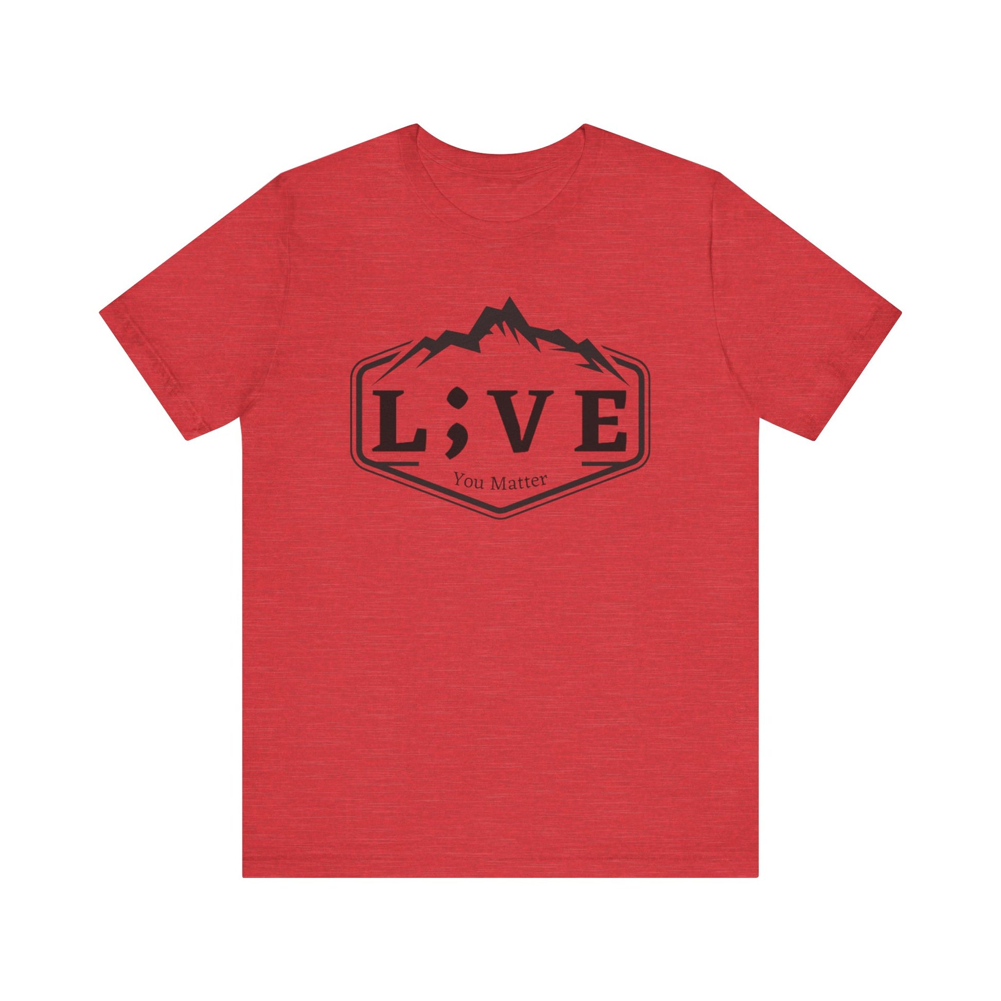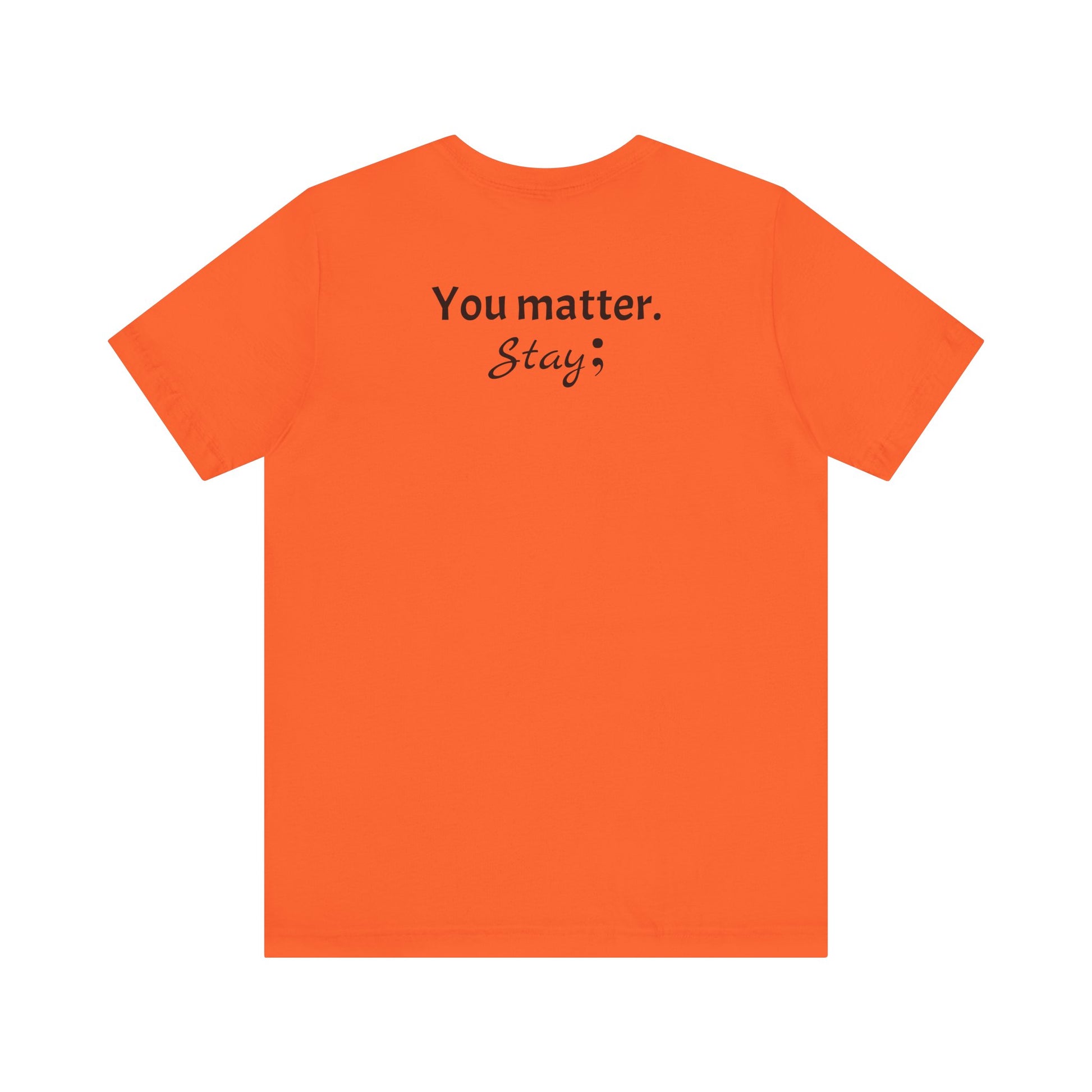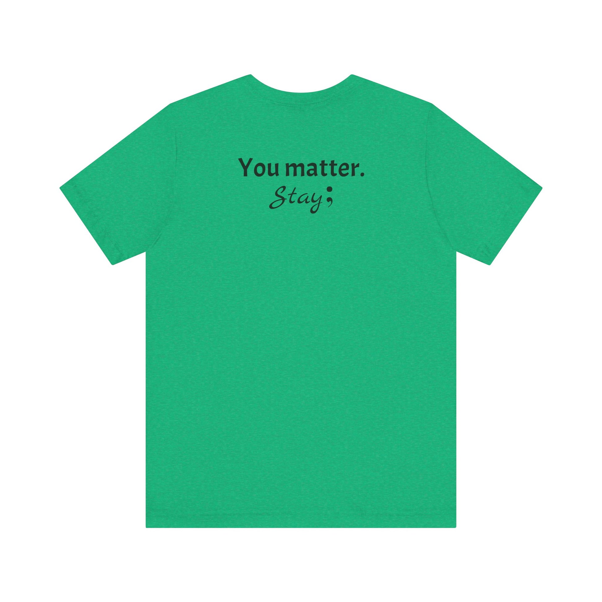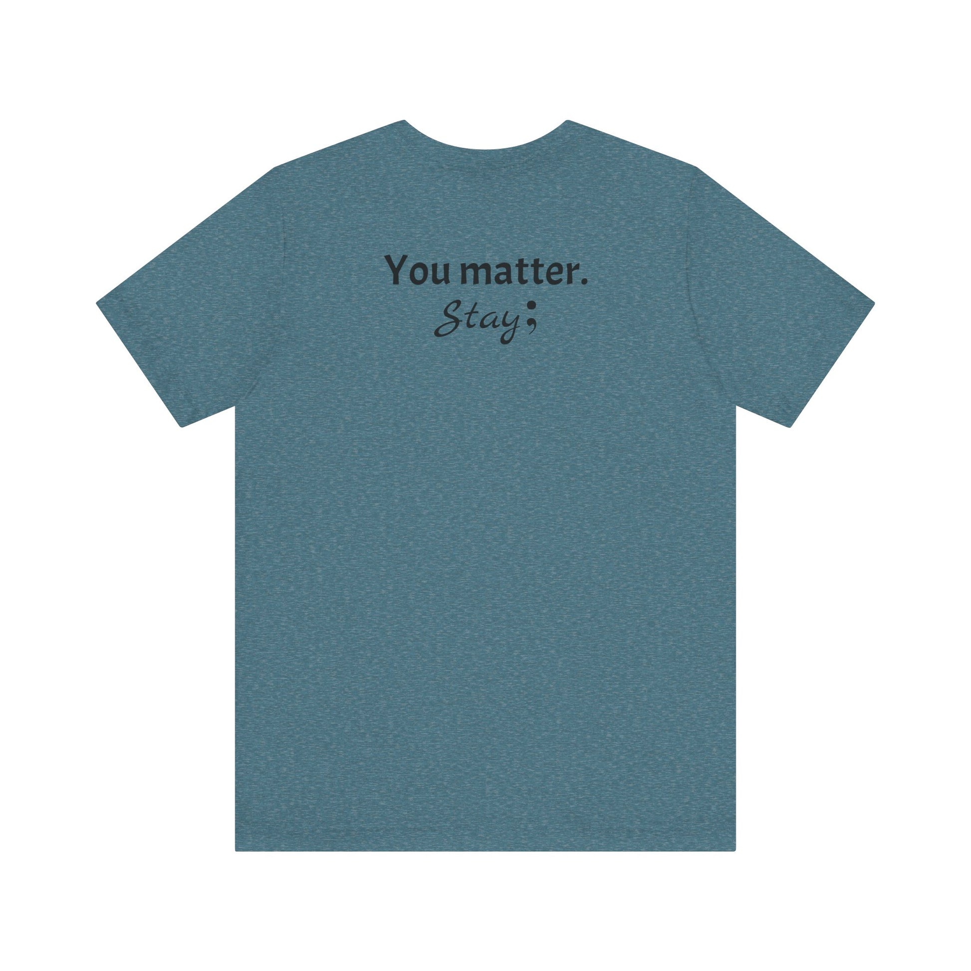 L;VE branded t-shirt with you matter. On the back, 'You Matter. Stay;'. The subtle yet powerful message on the shirt promotes positivity, making it a great addition to your wardrobe. Ideal for casual outings, lounging at home, or even semi-formal gatherings, this tee reflects an uplifting vibe that resonates with those who cherish self-expression and mental well-being. Perfect as a thoughtful gift for friends and family during holidays, awareness events, or just to remind loved ones that 'You Matter.' Ideal for anyone looking to spread a little kindness and motivation in their daily life.