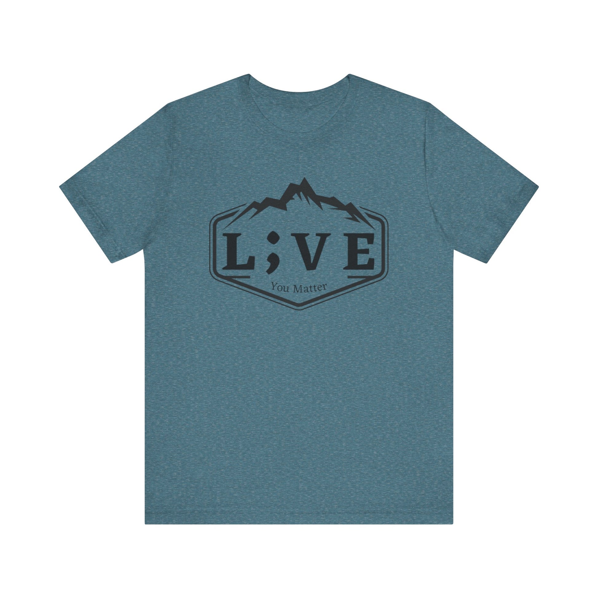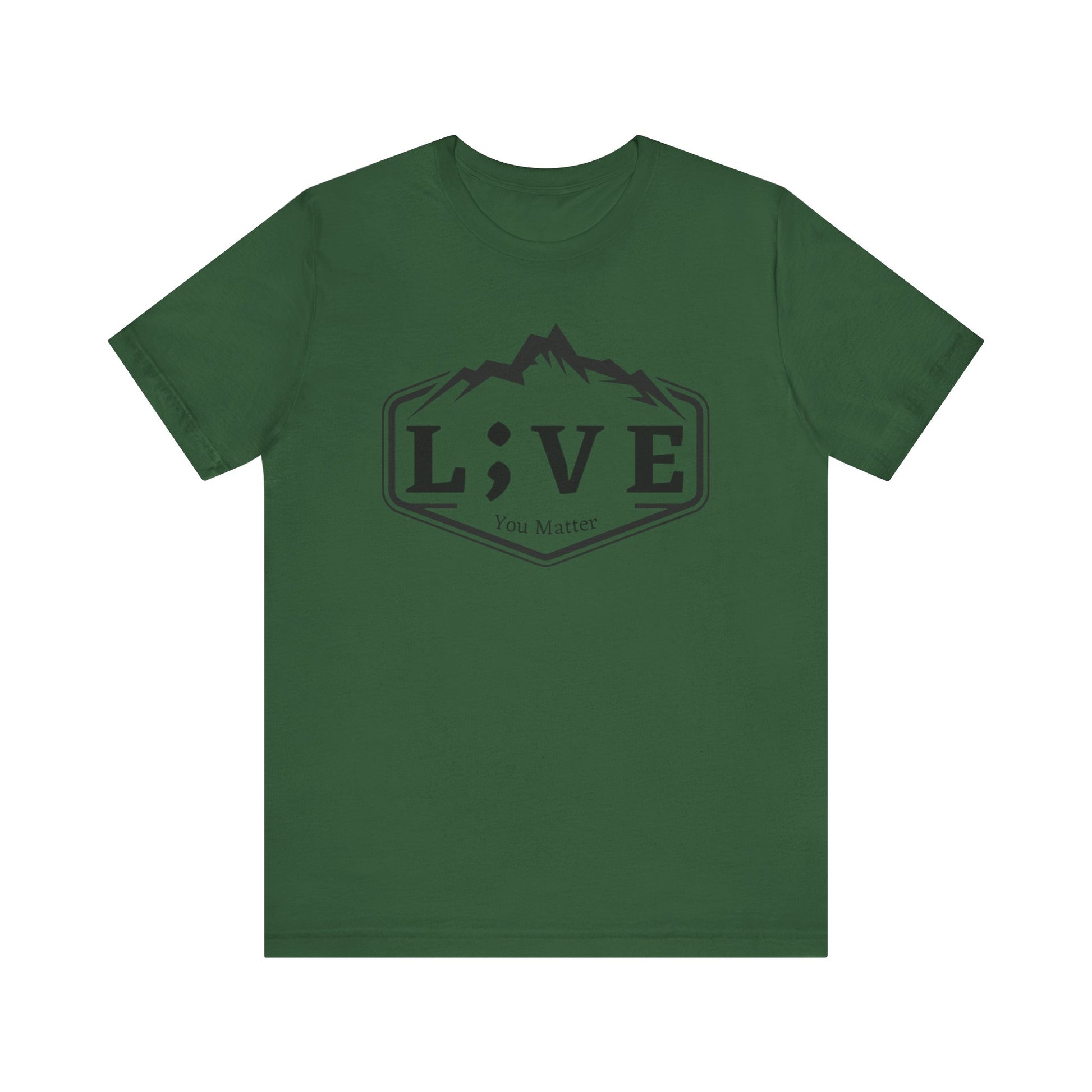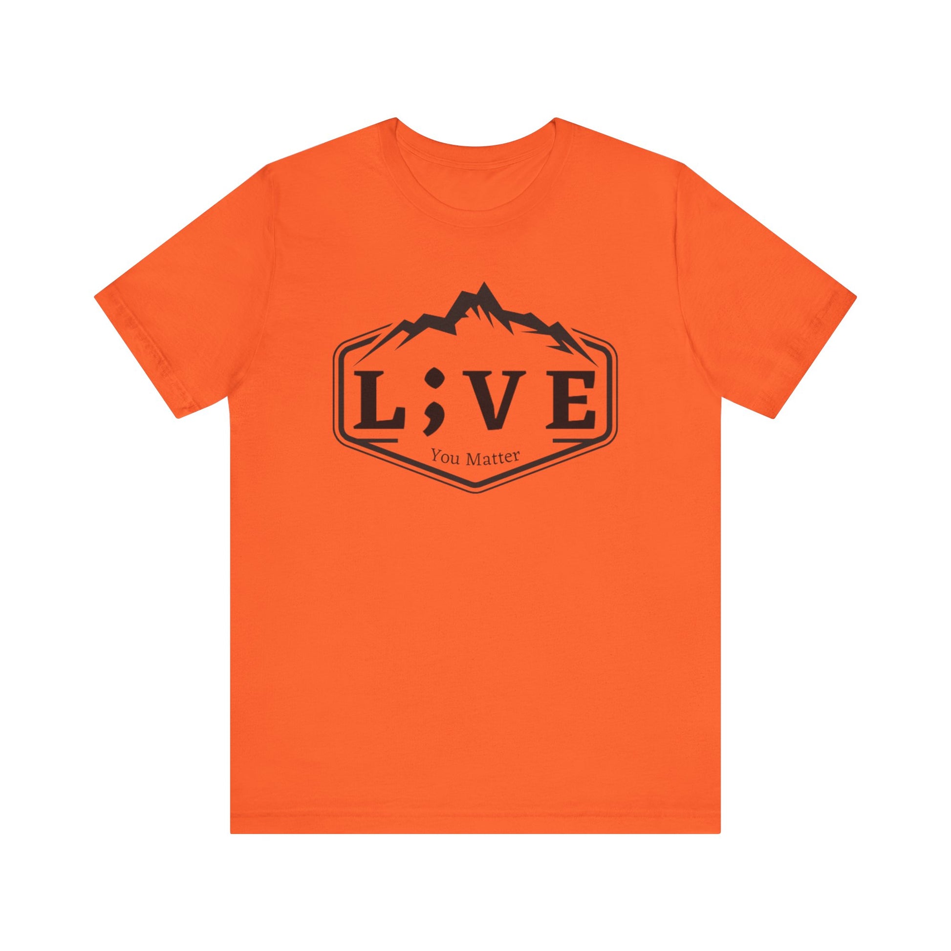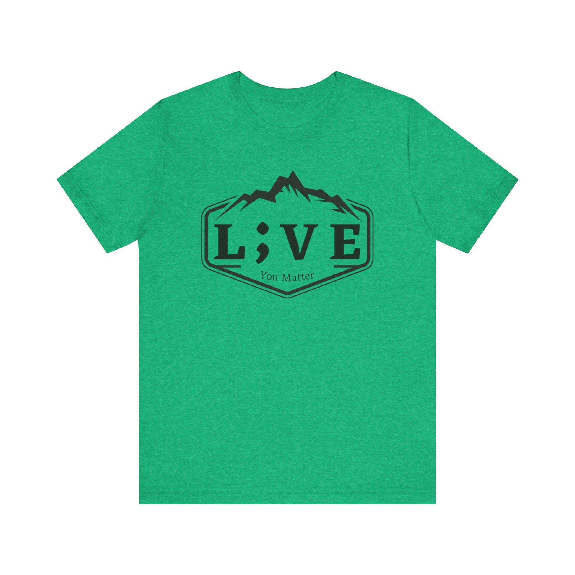 L;VE branded t-shirt with you matter. On the back, 'You Matter. Stay;'. The subtle yet powerful message on the shirt promotes positivity, making it a great addition to your wardrobe. Ideal for casual outings, lounging at home, or even semi-formal gatherings, this tee reflects an uplifting vibe that resonates with those who cherish self-expression and mental well-being. Perfect as a thoughtful gift for friends and family during holidays, awareness events, or just to remind loved ones that 'You Matter.' Ideal for anyone looking to spread a little kindness and motivation in their daily life.