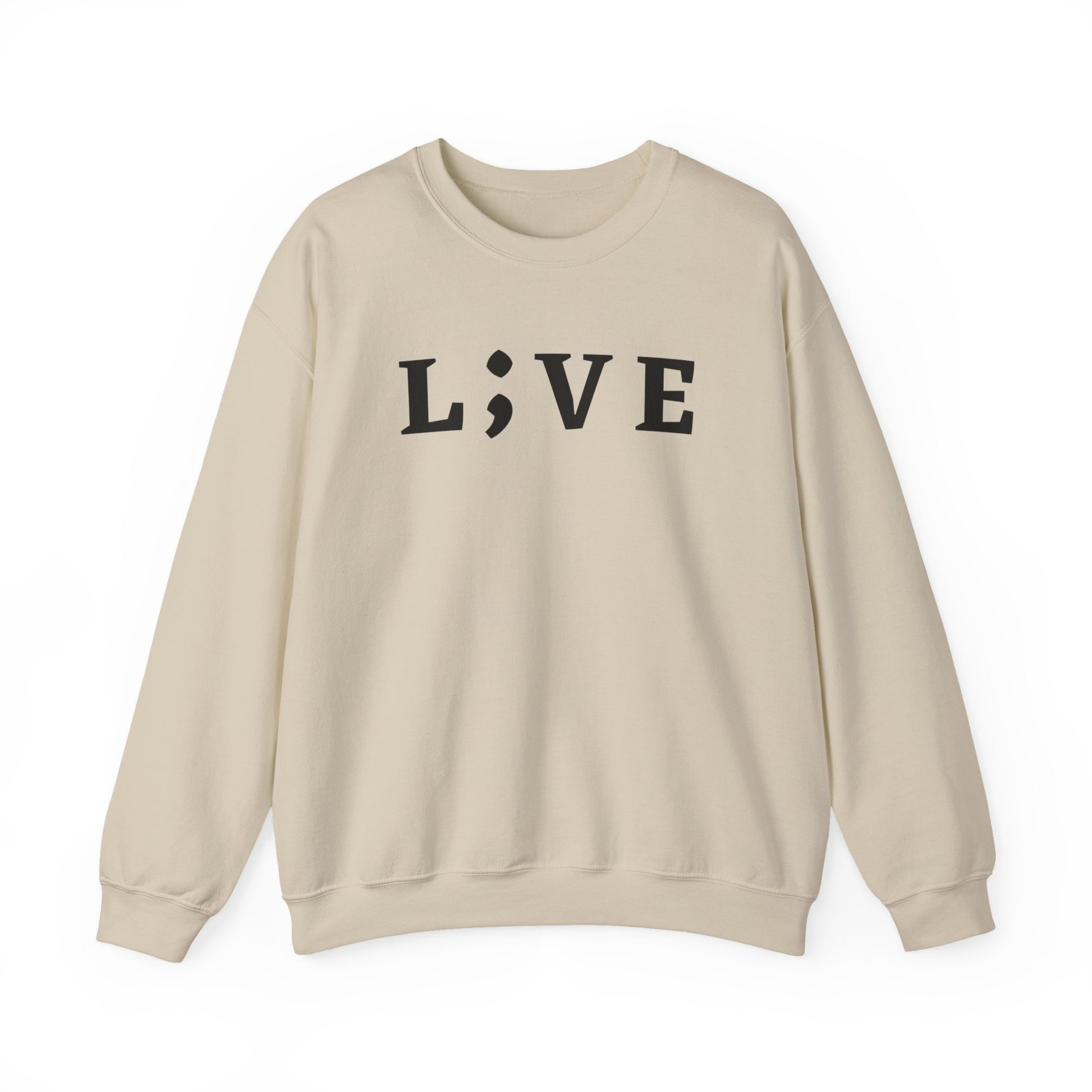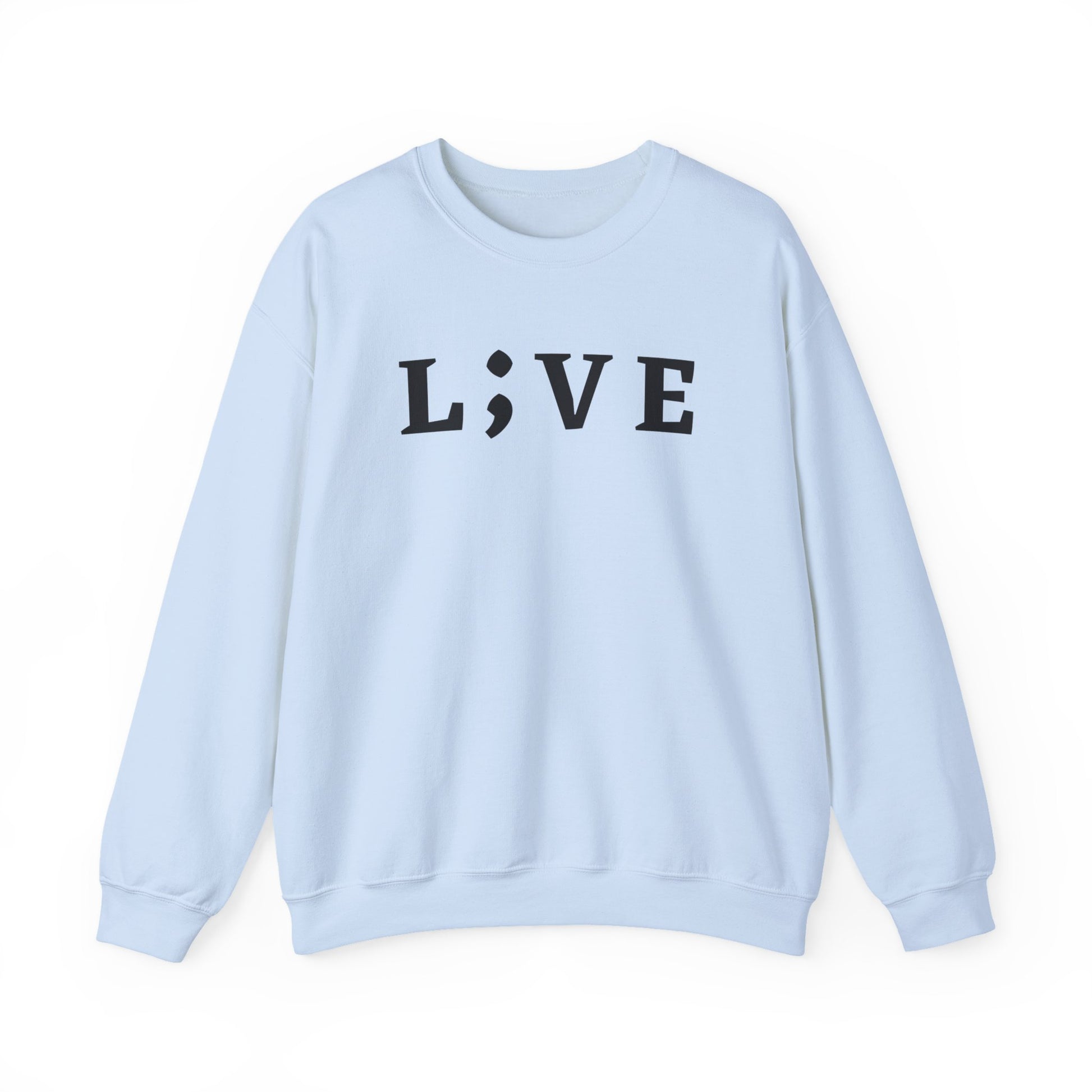 L;VE branded sweatshirt for suicide prevention and mental health awareness. This cozy and durable sweatshirt provides a comfortable wearing experience with a clean-cut style. Perfect for those colder months, it is relevant for individuals advocating for mental health and suicide prevention. Ideal for wearing during mental health awareness month and suicide prevention week.