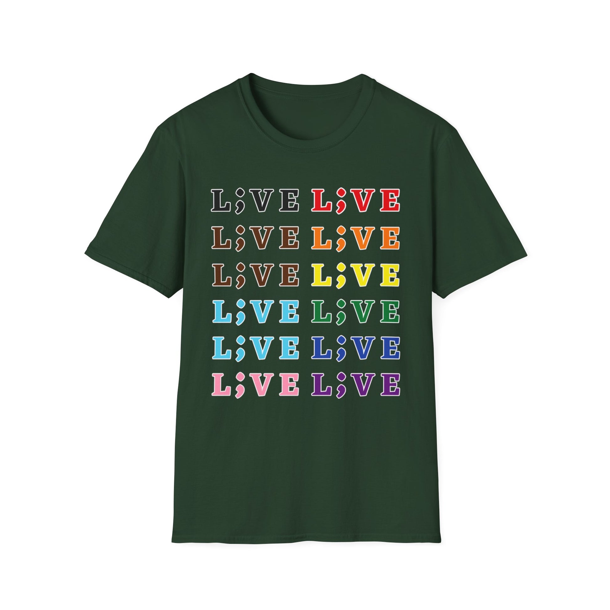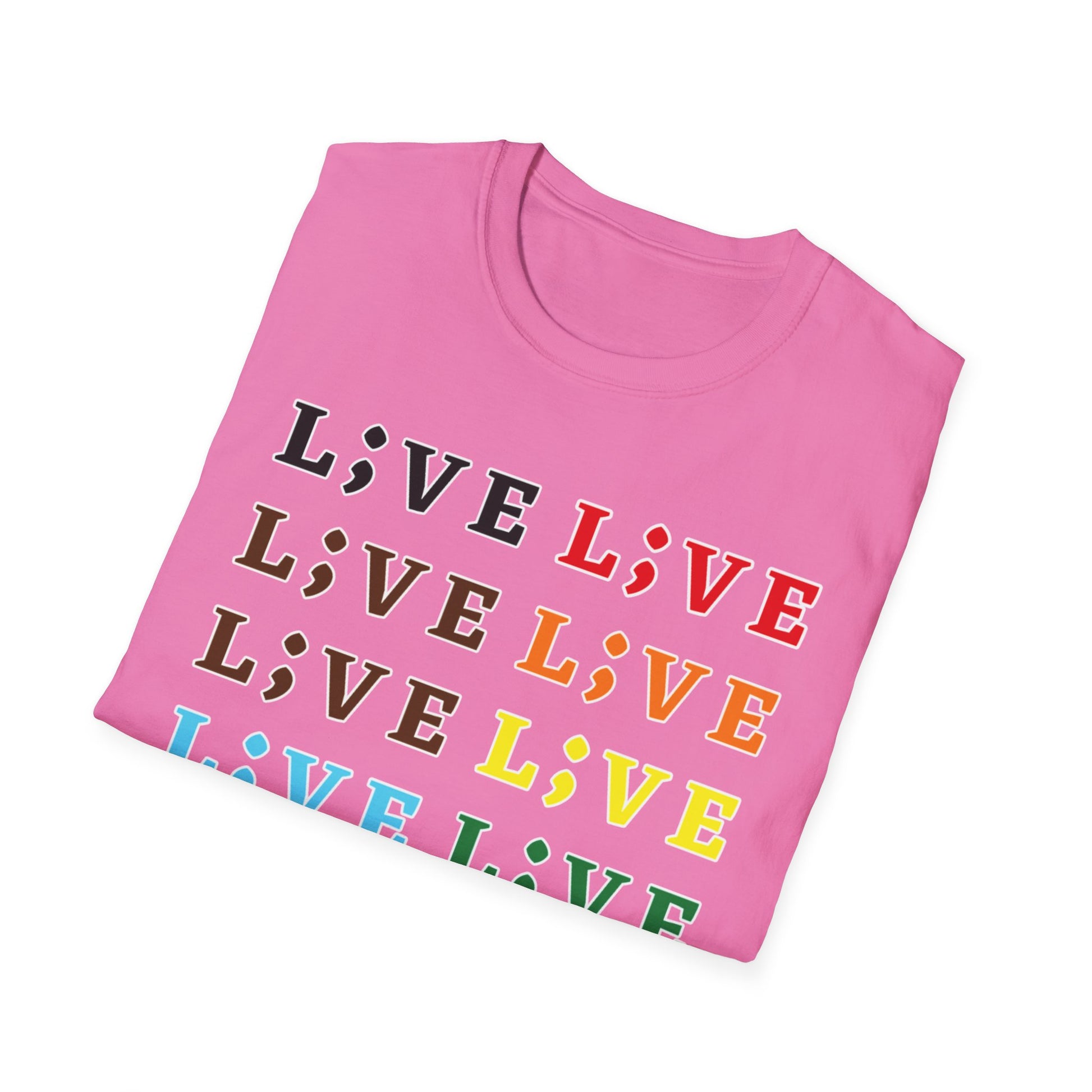 Show your support and spread awareness for suicide prevention with this Pride L;VE themed unisex T-Shirt. Made from durable and smooth fabric, this shirt is perfect for printing and features a classic fit with a crew neckline for versatile style. Suitable for adults, this shirt is relevant for suicide prevention awareness events and can be worn all year round.