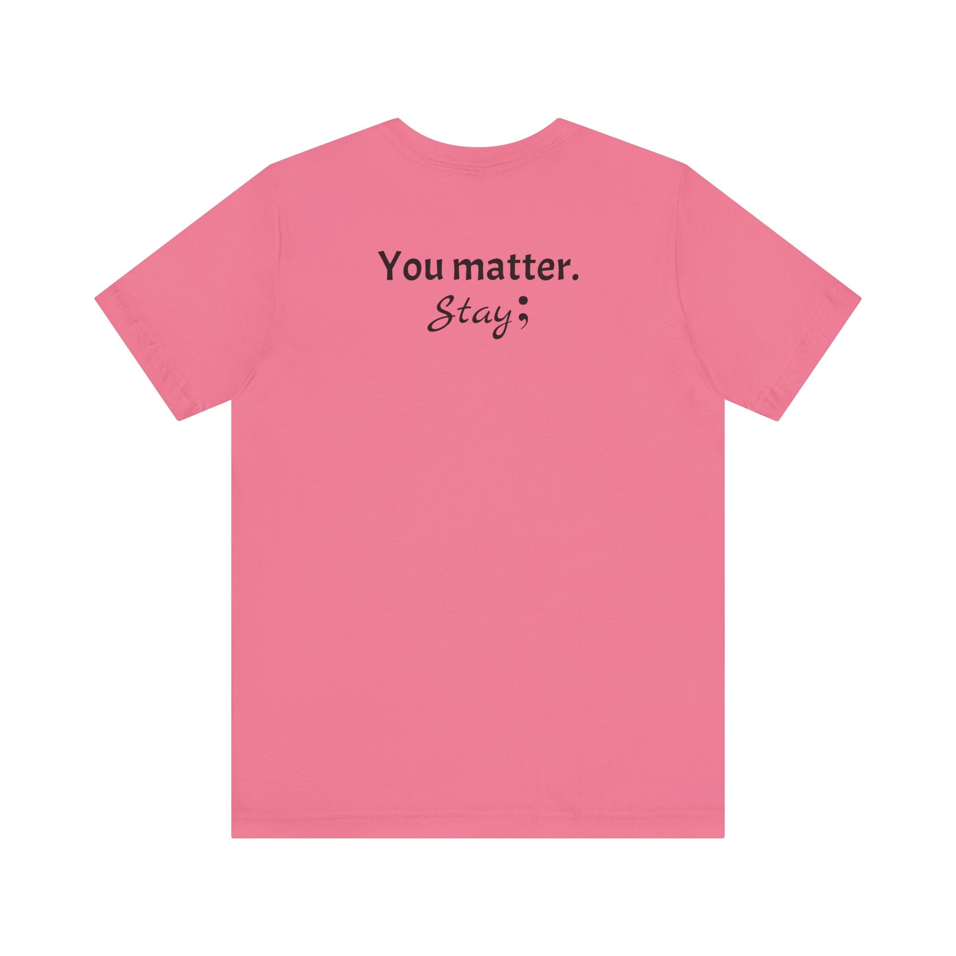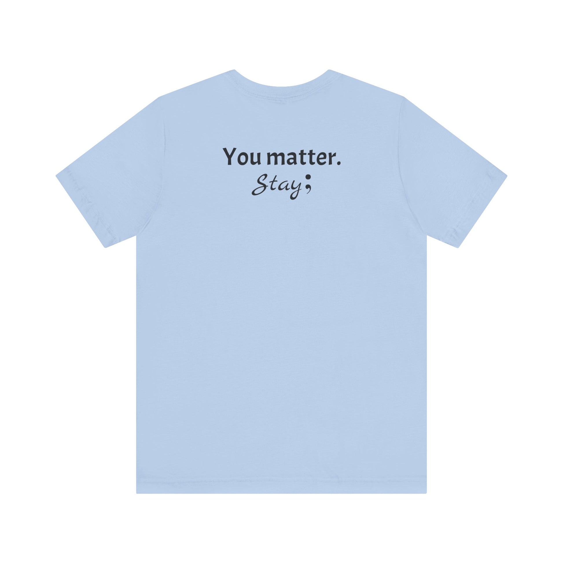 A supportive Reduce the Stigma T-shirt for suicide prevention awareness with 'You Matter Stay;' displayed on the back. Semicolon butterfly on the front. This tee is perfect for individuals passionate about mental health advocacy and spreading positivity. Ideal for wearing at rallies, events, fundraisers, or casual outings.